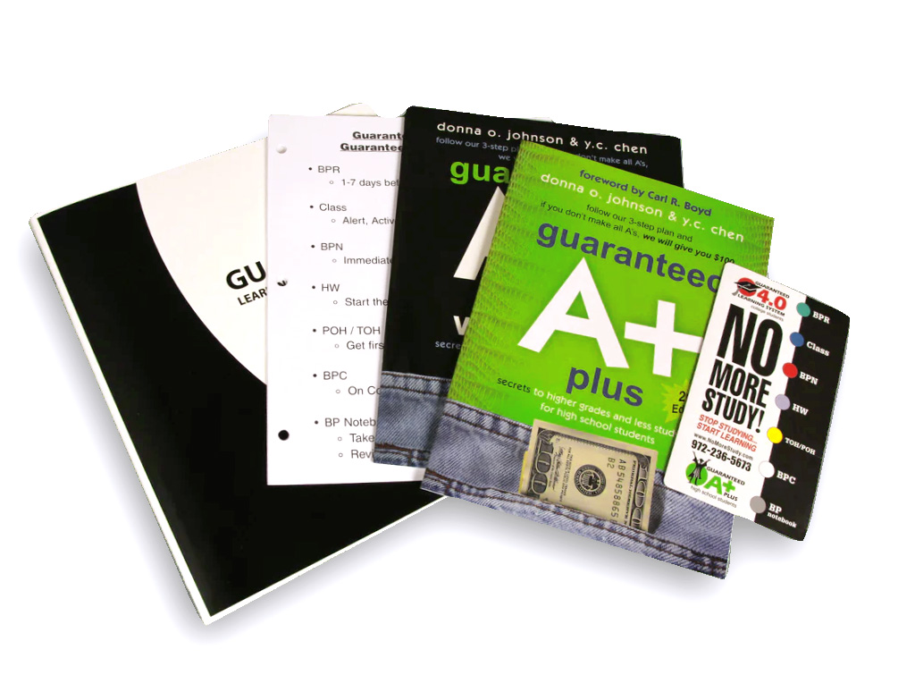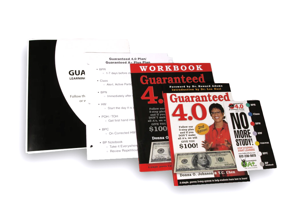The Guaranteed 4.0 Learning System is an innovative path to excellence and professional success! Designed to ensure both top grades and effective learning, the Guaranteed 4.0 plan has proven results. If students follow the Guaranteed 4.0 plan exactly and fail to make all A’s, they receive $100.